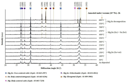 采用磁控共濺射法沉積得到Mg-Sn薄膜(21≤at.% Sn≤42.5)。薄膜結(jié)構(gòu)受Sn原子濃度的影響。含21≤at.%Sn≤25的薄膜具有fcc-Mg2Sn結(jié)構(gòu),第二相為Mg。后者消失,fcc-Mg2Sn結(jié)構(gòu)在30≤at. %Sn<33.5范圍內(nèi)保持穩(wěn)定。35≤at.%Sn≤37.4的薄膜表現(xiàn)為立方和正交Mg2Sn相的混合物。含37.6到38的at.%Sn的薄膜為正交Mg2Sn結(jié)構(gòu)。