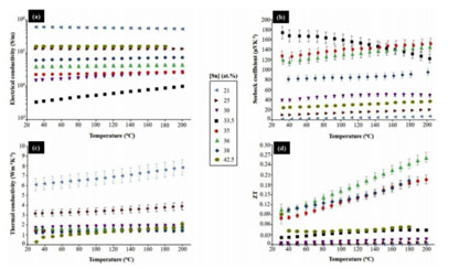 圖8:在真空(10-4pa)下用TFA系統(tǒng)測量Linseis晶片上沉積薄膜的熱電性能。(a)導(dǎo)電性,(b)Seebeck系數(shù),(c)導(dǎo)熱系數(shù)和(d)ZT與溫度的比值。