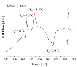圖1:51.7 B2O3/9.3 K2O/1 P2O5/27.6 Li2O/10.4 Fe2O3 玻璃在10 K min-1加熱速率下的DSC曲線。