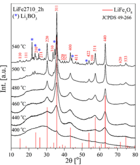 圖2:在400-540 ℃下2 h的LiFe2710玻璃陶瓷樣品的XRD譜圖。