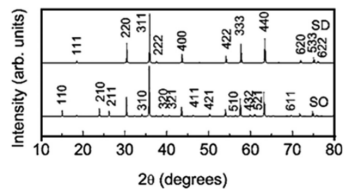 圖3:用于比較的尖晶石鋰鐵氧體有序(SO)和無(wú)序(SD)相的模擬XRD圖譜。