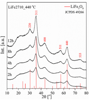 圖4:在440℃下不同時(shí)間結(jié)晶的LiFe2710微晶玻璃樣品的XRD圖譜。