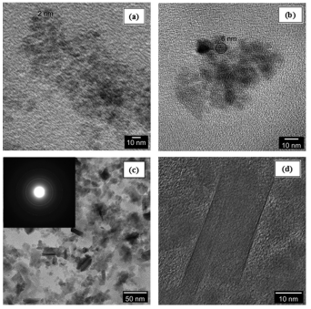 圖5:從(a)440℃結(jié)晶8h,(b)480℃結(jié)晶2h,(c)500℃結(jié)晶2h,以及(d)500℃結(jié)晶2h(放大倍數(shù)更高)的LiFe2710微晶玻璃樣品中通過復(fù)制提取獲得的顆粒的TEM顯微圖與HRTEM顯微圖相對(duì)應(yīng)。