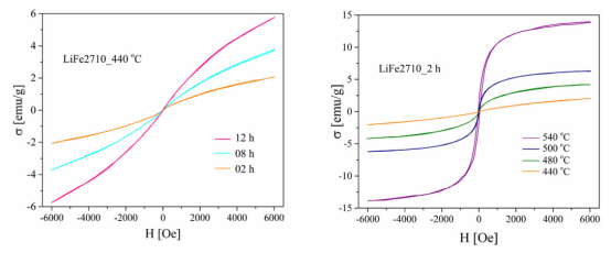 圖6:在440℃下熱處理2、8和12小時(shí)(左)以及在480、500和540℃下熱處理2小時(shí)(右)的LiFe2710微晶玻璃樣品的室溫磁化曲線。