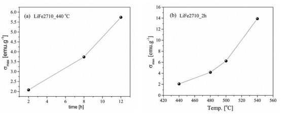 圖7:LiFe2710最大磁化強(qiáng)度的溫度和時(shí)間依賴性,(a)在440℃下結(jié)晶2、8和12小時(shí)的微晶玻璃樣品,以及(b)在480、500和540℃下結(jié)晶2小時(shí)的微晶玻璃樣品。