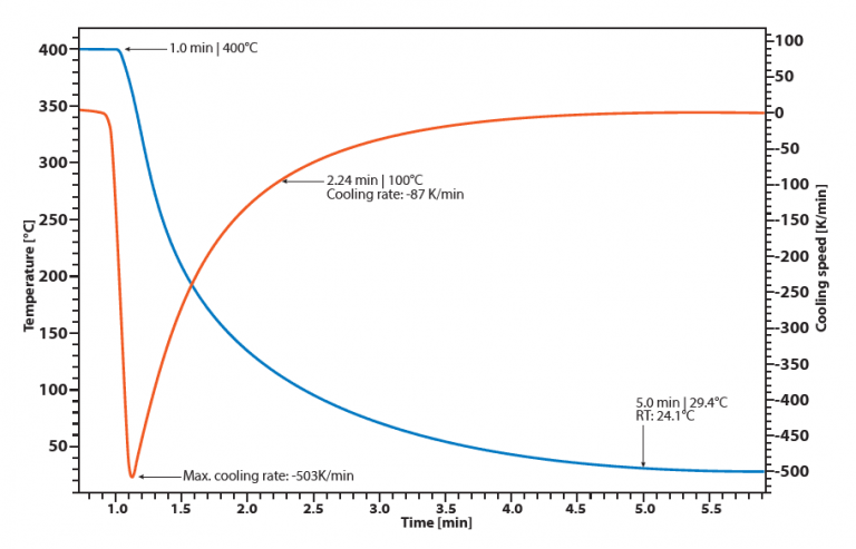 低熱質(zhì)量和革新性傳感器設(shè)計(jì),從400℃開(kāi)始冷卻速率可達(dá)500 K/min。即使冷卻至100℃,冷卻速度也可以達(dá)到90 K/min。