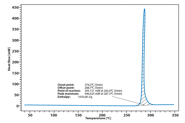 含能材料被用于安全氣囊,如固體推進(jìn)劑、爆破材料等。其他類(lèi)型的DSC,都存在傳感器甚至爐體損壞的風(fēng)險(xiǎn),而芯片式DSC,操作人員可在較短時(shí)間內(nèi)以低成本輕松更換芯片(集成傳感器及加熱爐)。在很大程度上減少了儀器損壞時(shí)所需要的停機(jī)時(shí)間,幾秒鐘即可更換傳感器,半小時(shí)即可完成校準(zhǔn)。圖例為2.8mg安全氣囊點(diǎn)火器的DSC曲線圖。