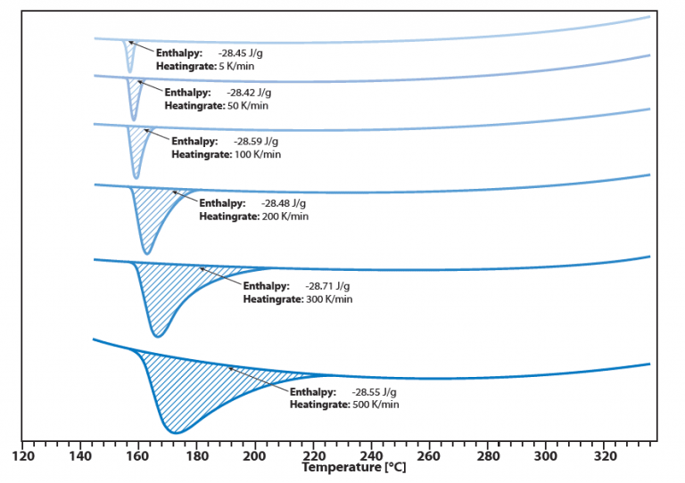 加熱速率可達(dá)1000 K/min,同時(shí)仍能保持良好的熔化焓重現(xiàn)性。如圖示例,以不同的加熱速率(5 K/min;50 K/min;100 K/min;200 K/min;300 K/min和500 K/min)測(cè)量銦的熔點(diǎn)。一個(gè)完整的測(cè)量過(guò)程(包括加熱和冷卻),在10分鐘內(nèi)就可以完成,無(wú)需其他冷卻裝置。