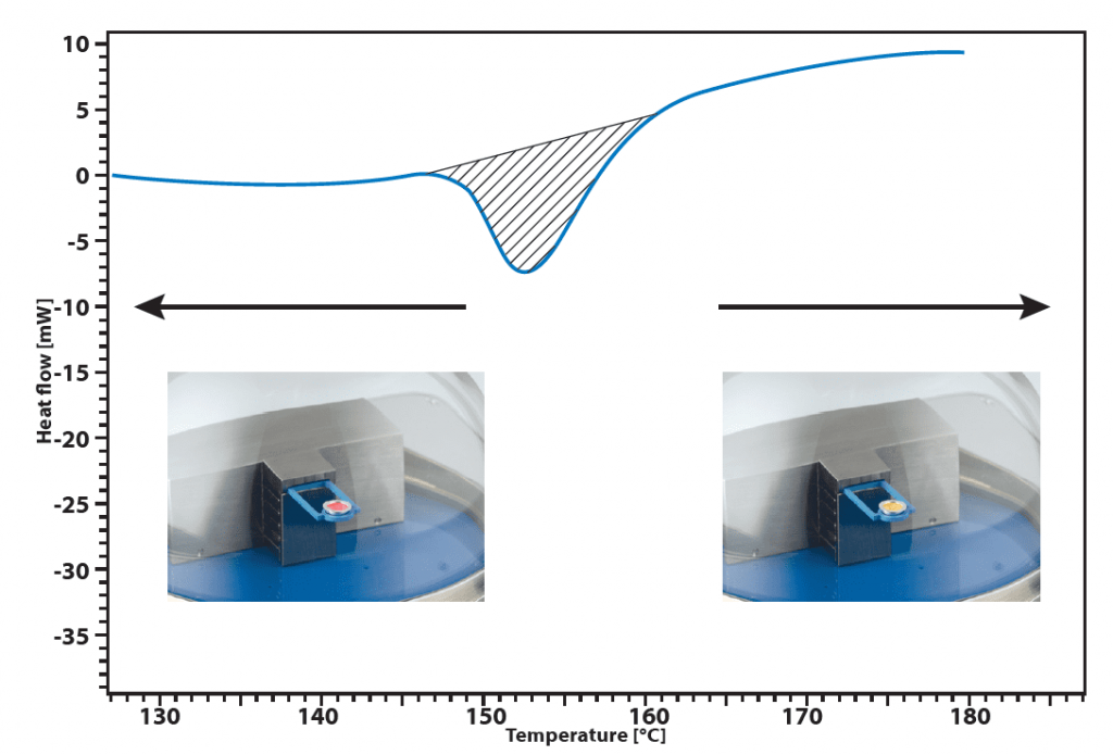 下圖為熱致變色材料的示例,在160℃時(shí)發(fā)生了吸熱相變。在此相位,通過(guò)CHIP DSC的透明蓋子可以觀測(cè)到從紅色到黃色的顏色變化。(可選記錄圖像的照相機(jī)功能)。