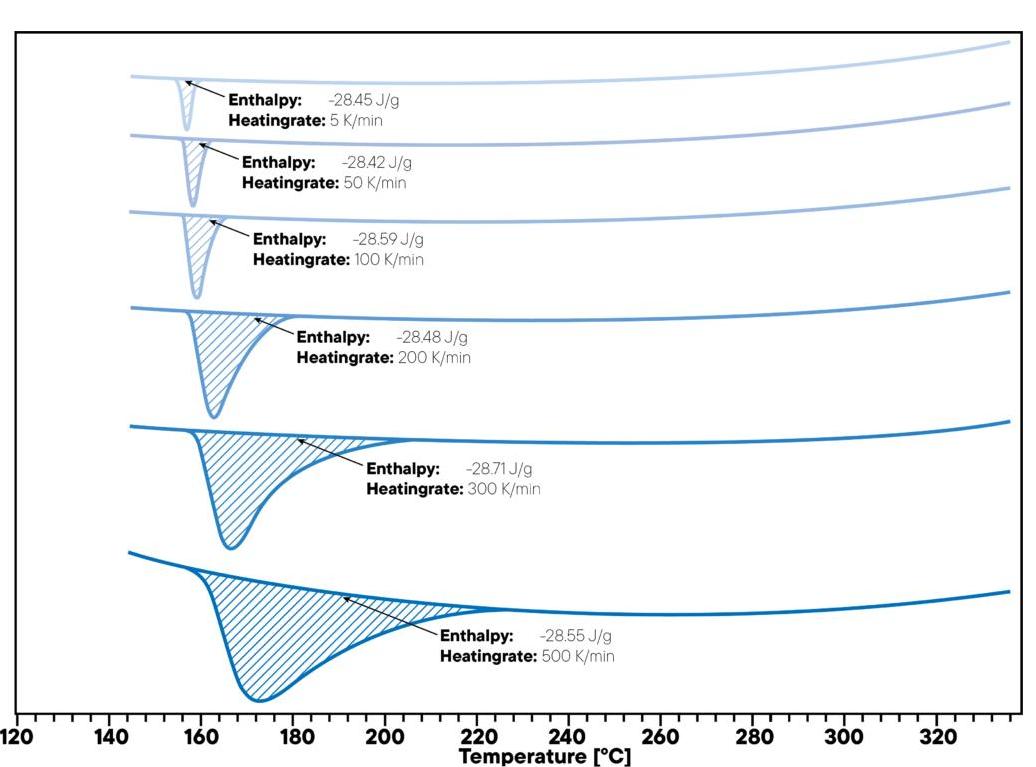 加熱速率可達 1000 K/min ,同時仍能保持良好的熔化焓重現(xiàn)性。如圖示例,以不同的加熱速率(5 K/min;50 K/min;100 K/min;200 K/min;300 K/min 和 500 K/min)測量銦的熔點。一個完整的測量過程(包括加熱和冷卻),在 10 分鐘內(nèi)就可以完成,無需其他冷卻裝置。