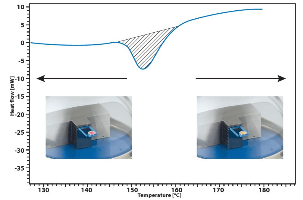 如圖顯示了熱致變色材料在 160 °C 時發(fā)生吸熱相變,這個相態(tài)具有不同的顏色,透過透明蓋子可以看到從紅色到黃色的顏色變化(可選記錄圖像的照相機功能)。