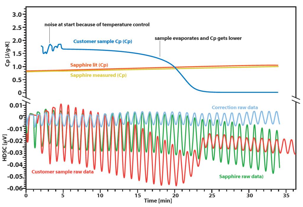 如圖顯示的是藍寶石比熱容的調(diào)制測量,加熱速率為 10 K/min ,振幅為 3 K 。由于溫度變化迅速,樣品比熱容導(dǎo)致振幅變化,因此可以獲得良好的信號質(zhì)量,從而可以評估比熱容,誤差僅為 3.5% ,這一結(jié)果明顯優(yōu)于大多數(shù) DSC 設(shè)備。