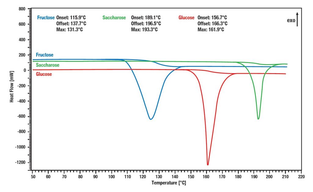 三種加工糖(果糖、葡萄糖和蔗糖)具有不同的熔點,可以使用差示掃描量熱儀(DSC)精確測定。因此,這種方法可用于鑒定混合物中的化合物,以及研究食品和其他產(chǎn)品的分解和熔化行為。