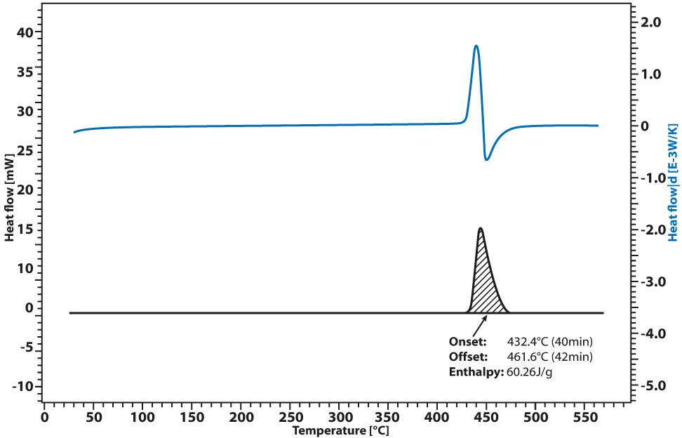 樣品以 10 K/min 的速率從室溫加熱到 600 °C ,棉花成分的燃燒峰值在 430 °C 左右清晰可見。根據(jù)稱量的質(zhì)量,釋放的熱焓約為 60 J/g ,這樣就可以量化棉花成分。黑色曲線顯示的是熱流信號,藍色曲線顯示的是 DSC 信號隨溫度變化的一階導數(shù),以確定反應的確切起點和終點以及反應峰的最大值。