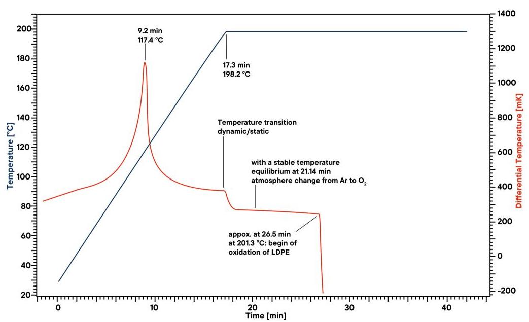 為了能夠預測 PE(聚乙烯,一種典型的包裝用材料)等聚合物的老化和氧化行為,通常會使用 OIT 測試。因此,聚合物在氧氣的氣氛下使用 DSC 進行測試。
