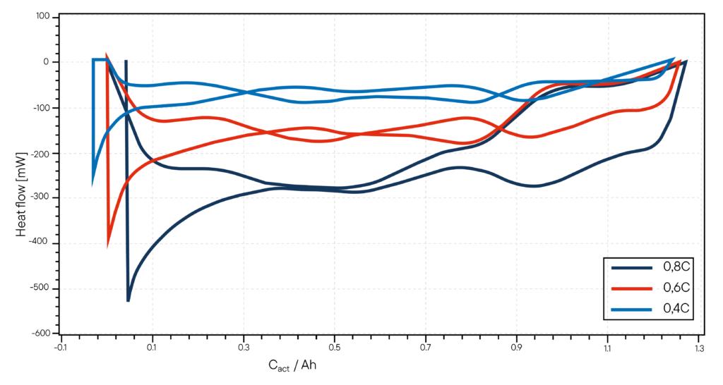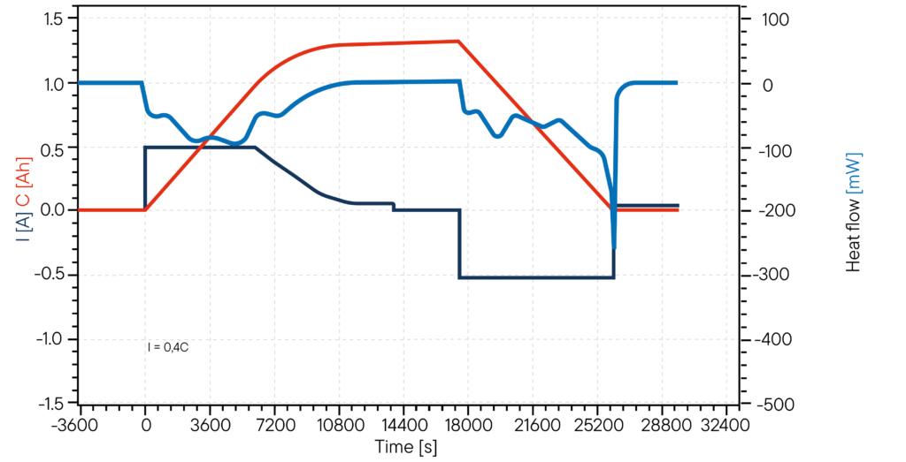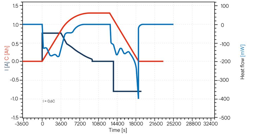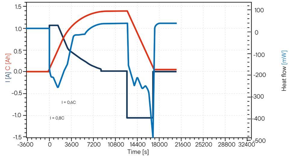 這個(gè)例子展示了單節(jié)鋰離子電池在不同充放電電流下的熱流行為,該測(cè)量為了解電池在循環(huán)過程中所承受的熱應(yīng)力提供了有價(jià)值的信息。