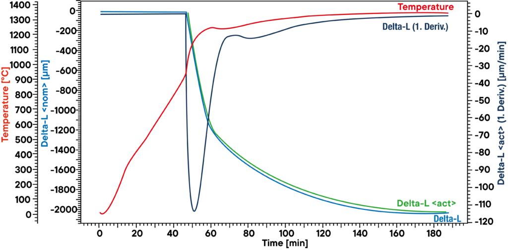 在這個實驗中,燒結(jié)速率由 RCS 軟件定義并編程為保持恒定。紅色曲線顯示了樣品的溫度,因而也體現(xiàn)了加熱速率。藍(lán)色和綠色曲線顯示了長度的變化,紫色曲線是長度變化的導(dǎo)數(shù)。樣品在 L75 水平膨脹儀中以線性方式升溫,50 分鐘后,燒結(jié)過程在大約 900 °C 開始,RCS 軟件提高了加熱速率,以實現(xiàn)線性燒結(jié),直到在大約 60 分鐘時燒結(jié)速率顯著降低。然后軟件降低了加熱速率,樣品長度最終在大約 180 分鐘時達(dá)到平穩(wěn)狀態(tài),此時已燒結(jié)的二氧化鋯達(dá)到了最終密度。