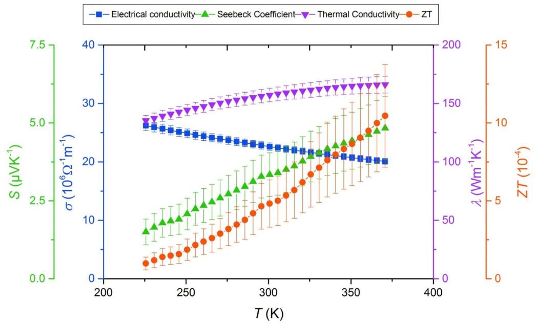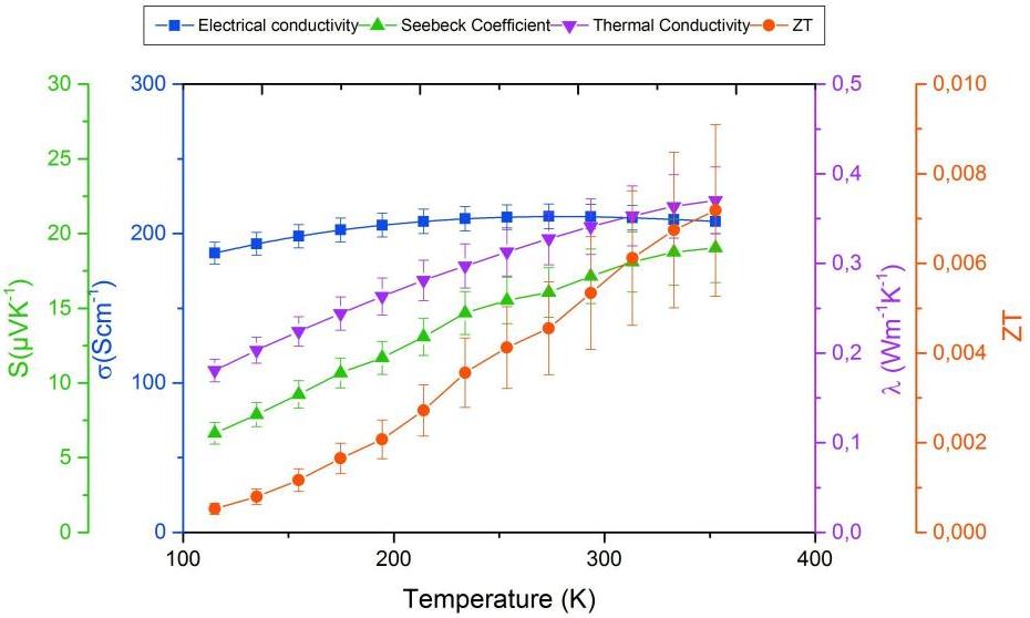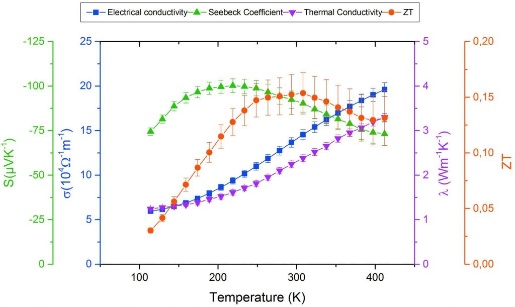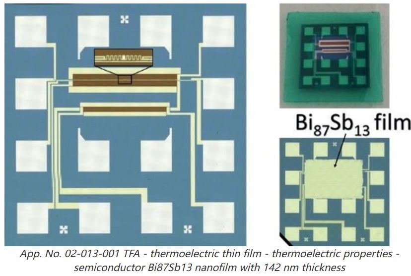 熱電材料用于熱電發(fā)電機,通過溫度梯度將熱能轉化為電能。使用熱電優(yōu)值(ZT)來表征熱電材料的性能。為了計算熱電優(yōu)值,必須知道熱導率、電導率和塞貝克系數。與相同成分的塊狀材料相比,薄膜具有較低的熱導率,而電導率和塞貝克系數受影響較小,因此 ZT 值較高。