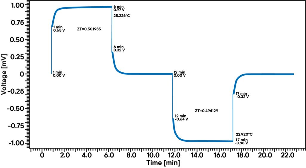 使用 Harman 法結(jié)合林賽斯 LSR-3 測(cè)量系統(tǒng),分析了 NIST (SRM 3451)? 碲化鉍(Bi2Te3)參考物質(zhì)。測(cè)量結(jié)果清楚地顯示了在單個(gè)溫度測(cè)量點(diǎn)的典型電壓分布。在這種情況下,通過(guò)設(shè)置歐姆壓降和熱電壓降的關(guān)系,可以簡(jiǎn)單地計(jì)算出室溫下的熱電優(yōu)值 ZT ,在室溫下ZT值為 0.50 。