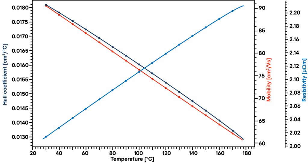 該圖顯示了一種厚度為 150 nm 的銻(Sb)薄膜樣品在室溫至 180 ℃ 的范圍內(nèi)霍爾系數(shù)、遷移率和電阻率的測(cè)量。它廣泛應(yīng)用于熱電材料領(lǐng)域(以合金的形式,例如 Bi1?XSbX),并在新興微電子領(lǐng)域中也有廣泛應(yīng)用?。然而,金屬銻的最大應(yīng)用是鉛酸電池中的鉛銻板。藍(lán)色曲線表示電阻率隨著溫度的升高而增加,對(duì)金屬樣品而言是正常的。橙色的曲線表示載流子的遷移率,其隨著電阻率的增加而減小。綠色曲線表示霍爾系數(shù),它描述了載流子對(duì)外部磁影響的靈敏度。