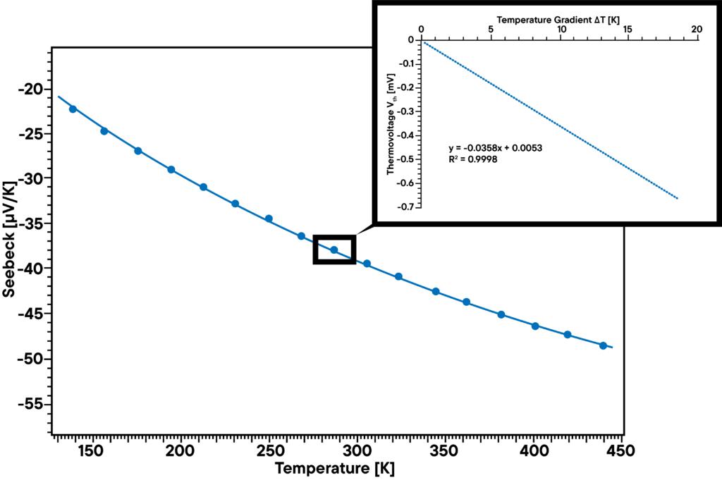 在 -143 °C 至 172 °C(130 K 至 445 K)的溫度范圍內(nèi)測(cè)量康銅參考樣品的塞貝克系數(shù),使用斜率方法(見(jiàn)插圖)來(lái)測(cè)量每個(gè)溫度點(diǎn)的塞貝克系數(shù)。在每個(gè)溫度下,對(duì)樣品施加多個(gè)溫度梯度,并從所得直線的斜率來(lái)計(jì)算塞貝克系數(shù)。結(jié)果可以用相對(duì)塞貝克系數(shù)或絕對(duì)塞貝克系數(shù)對(duì) Pt 作圖。