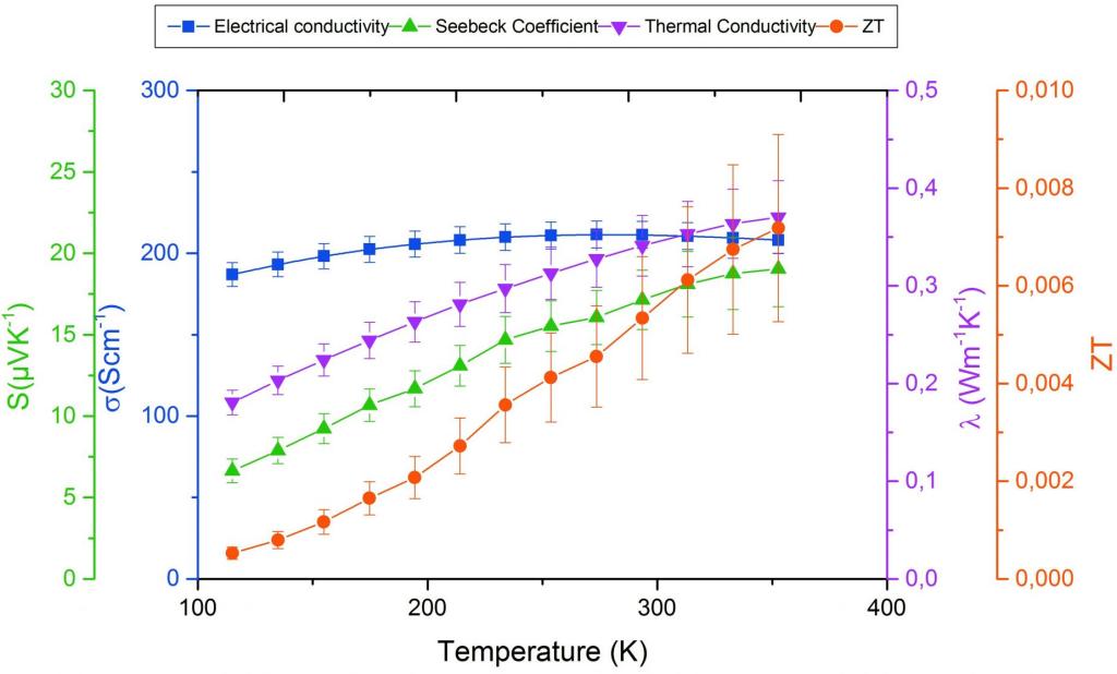 熱電材料用于熱電發(fā)電機(jī),通過(guò)溫度梯度將熱能轉(zhuǎn)化為電能。使用熱電優(yōu)值(ZT)來(lái)表征熱電材料的性能。為了計(jì)算熱電優(yōu)值,必須知道熱導(dǎo)率、電導(dǎo)率和塞貝克系數(shù)。與相應(yīng)的塊狀材料相比,金屬薄膜具有較低的熱導(dǎo)率,而電導(dǎo)率和塞貝克系數(shù)受影響較小,因此 ZT 值較高。金屬薄膜在工業(yè)上具有廣泛的應(yīng)用,例如用于集成電路的制造。