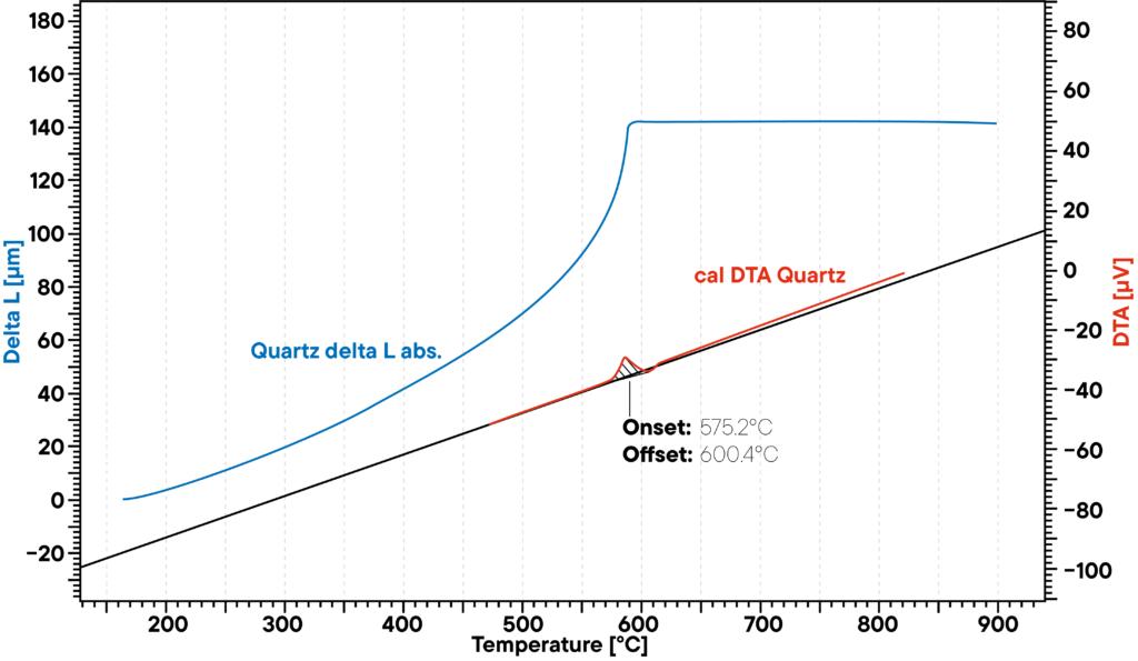 本實(shí)驗(yàn)所測量的 α-二氧化硅的相變大約發(fā)生在 575 °C 。藍(lán)色曲線顯示了所測量的絕對 ΔL 值與溫度的關(guān)系,這是熱膨脹儀顯示的標(biāo)準(zhǔn)信號。測量的 DTA 曲線(紅色曲線)是通過對設(shè)定溫度和實(shí)際樣品溫度進(jìn)行數(shù)學(xué)評估而生成的。它顯示出一個峰值,該峰值指示材料的相變,如同經(jīng)典的差示掃描量熱法(DSC)或差熱分析(DTA)所顯示的那樣。應(yīng)用差熱分析(DTA)功能可以在膨脹曲線沒有提供明確起始點(diǎn)的情況下確定精確的相變溫度。所測量的溫度(575.2 °C)與文獻(xiàn)值(574 °C)之間的偏差可用于溫度校準(zhǔn)。