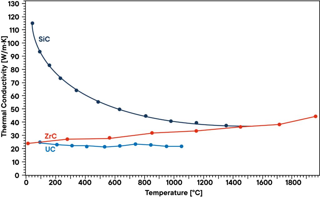 如下圖所示,使用 LFA L52 測定了三種不同類型的汽車襯墊的熱導(dǎo)率。鈾衍生物(UC)呈現(xiàn)出較低的熱導(dǎo)率,并且在測試溫度范圍內(nèi)幾乎是恒定的,約為 25 W/(m·K) 。碳化鋯(ZrC)的熱導(dǎo)率則隨著溫度升高呈現(xiàn)上升的趨勢,而碳化硅(SiC)的熱導(dǎo)率隨著溫度的升高呈現(xiàn)下降的趨勢,并在較高溫度下趨于穩(wěn)定。