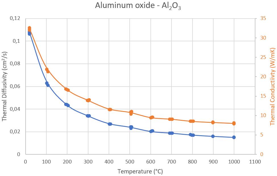 如下圖顯示了使用 LFA L52 測量氧化鋁樣品在室溫至 1000 ℃ 范圍內(nèi)的熱擴(kuò)散率和導(dǎo)熱系數(shù)的測量結(jié)果。對于計算樣品導(dǎo)熱系數(shù)所需的密度和比熱容,均采用文獻(xiàn)值。從圖中可以看到,氧化鋁樣品室溫下的導(dǎo)熱系數(shù)約為 32 W/(m·K) ,其熱擴(kuò)散率和熱導(dǎo)系數(shù)均隨著溫度的升高而降低,該變化規(guī)律符合期望結(jié)果。
