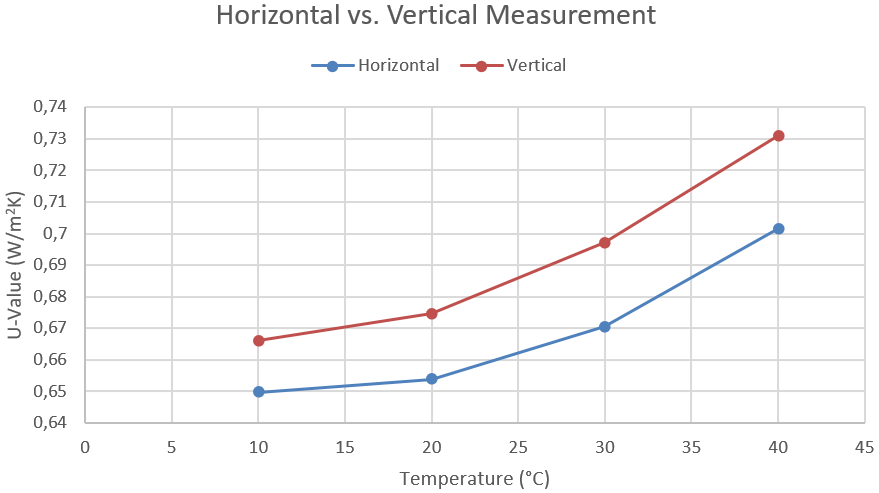 如下圖顯示了水平和垂直方向傳熱系數(shù)(U 值)測量結(jié)果的顯著差異,這是由于保溫層內(nèi)的對流效應(yīng)引起的。