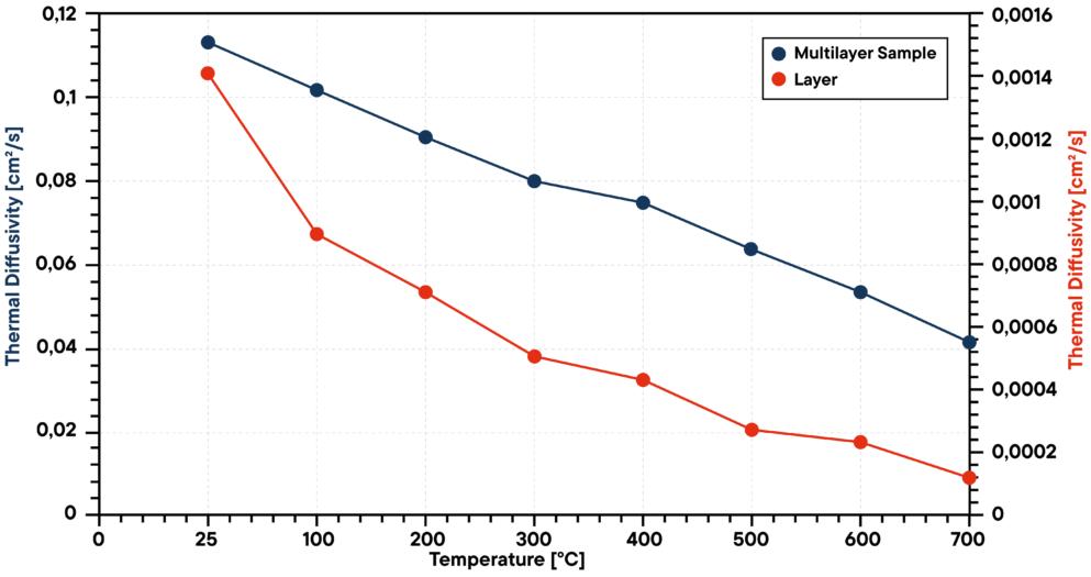 下圖中藍(lán)色曲線展示了使用 LFA L52 對多層樣品熱擴(kuò)散率的測量結(jié)果,該樣品由基底和厚度約 60 μm 的涂層組成。結(jié)果顯示,樣品熱擴(kuò)散率隨溫度的升高呈現(xiàn)近乎恒定的下降趨勢。隨后使用多層模型對整個(gè)樣品的測量數(shù)據(jù)進(jìn)行分析。在此過程中,需要已知基底和涂層的厚度,同時(shí),還需知道或測量基底的熱擴(kuò)散率。若已知各層的其他物理性質(zhì)(如密度和比熱容),則可進(jìn)一步計(jì)算出基底和涂層這兩層的熱導(dǎo)率。橙色曲線展示了涂層熱擴(kuò)散率的評估結(jié)果,其數(shù)值顯著低于對整個(gè)樣品直接測量所得的結(jié)果。