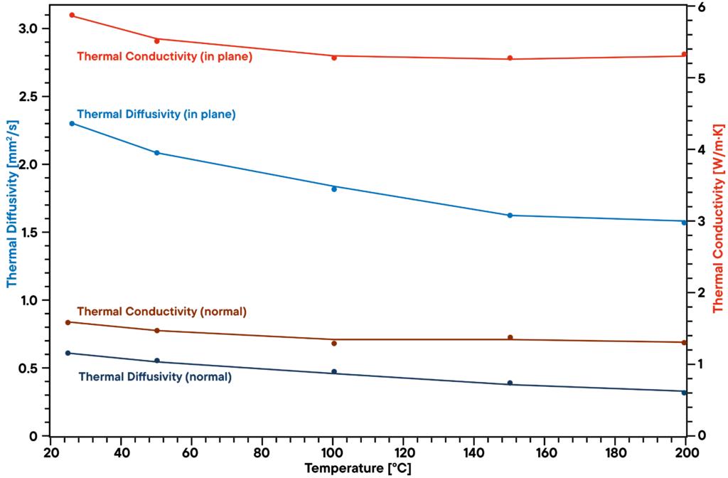 圖中顯示了使用 LFA L51 測量銅纖維樣品在室溫至 200 ℃ 范圍內(nèi)的熱擴(kuò)散率和熱導(dǎo)率的結(jié)果,面內(nèi)的熱導(dǎo)率和熱擴(kuò)散率明顯高于纖維取向方向的測量結(jié)果。因此,這種面內(nèi)的測量方法是分析材料性能和驗(yàn)證符合預(yù)期應(yīng)用的很好工具。