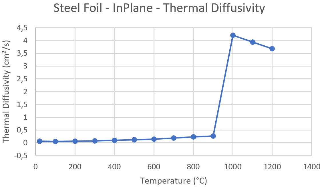 在室溫至 1200 ℃ 范圍內(nèi)對薄鋼箔進(jìn)行測量。從室溫到 900 ℃ ,熱擴(kuò)散系數(shù)隨著溫度的升高而增大。在 900 ~ 1000 ℃ 之間,熱擴(kuò)散系數(shù)迅速增大。在這個(gè)溫度區(qū)間內(nèi),樣品開始熔化,導(dǎo)致劇烈的熱擴(kuò)散率變化,隨后,溫度的進(jìn)一步升高導(dǎo)致熱擴(kuò)散率降低。