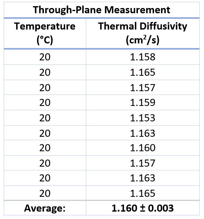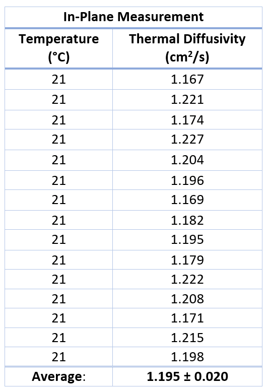 在室溫下分別測定 10 次和 15 次。兩次測量之間的等待時(shí)間設(shè)置為兩分鐘,以確保樣品完全冷卻。通過面間模式測量的熱擴(kuò)散率平均值為 1.16 cm2/s ,極小的標(biāo)準(zhǔn)偏差表明LFA測量具有較高的精度。面內(nèi)測量模式得到的熱擴(kuò)散率平均值約為 1.20 cm2/s 。
