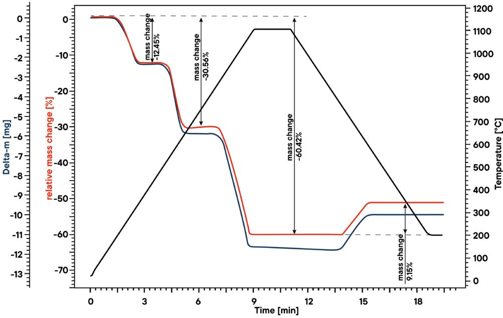 下述曲線展示了草酸鈣標(biāo)準(zhǔn)樣品的測量結(jié)果。藍(lán)色曲線和紅色曲線(分別為相對質(zhì)量變化和絕對質(zhì)量變化)存在三個(gè)質(zhì)量損失階段,其中第一個(gè)階段是脫去 H?O ,第二個(gè)階段是失去 CO ,第三個(gè)階段是失去 CO? 。生成的氧化鈣(CaO)隨后會與第一個(gè)階段釋放的水發(fā)生反應(yīng),即如果反應(yīng)環(huán)境為靜態(tài)氣氛,這些水會殘留在反應(yīng)室內(nèi),這表明在冷卻過程中,約 580 °C 時(shí)會生成氫氧化鈣(Ca(OH)?)。對于標(biāo)準(zhǔn)同步熱分析(STA)或熱重分析(TG)而言,由于冷卻速率較慢,這最后一個(gè)階段將難以觀察到。但在本案例中,整個(gè)測量周期僅需 20 分鐘即可完成,升降溫速率為 2 K/s ,但使用感應(yīng)式同步熱分析儀(STA),您可以輕松將速率提升至 100 K/s 。
