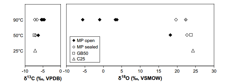 圖1:碳和氧同位素結(jié)果由“反常”樣品B21-WP單獨(dú)分析得到,按反應(yīng)溫度分組。開放符號(hào)代表“密封”系統(tǒng)中的反應(yīng),封閉符號(hào)代表發(fā)生反應(yīng),同時(shí)可低溫地除去可反應(yīng)的反應(yīng)產(chǎn)物。圍繞星號(hào)的菱形代表MP90-S*方法,其中反應(yīng)時(shí)間增加到3.5小時(shí)。