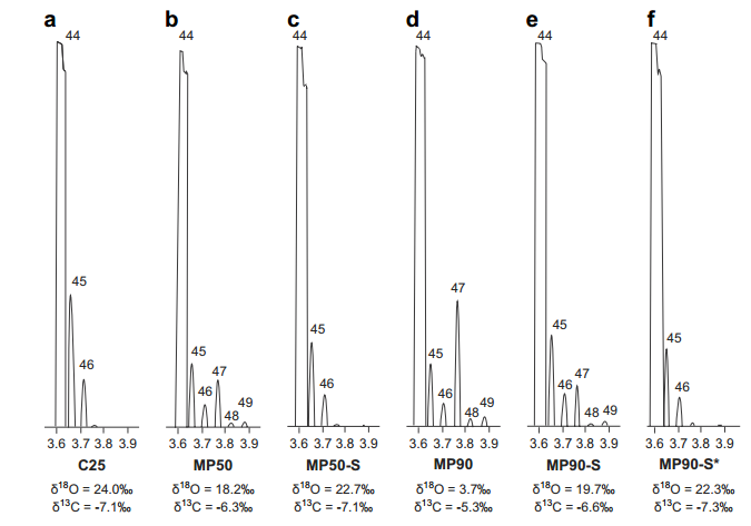 圖2:使用不同方法對(duì)樣品B21-WP與正磷酸反應(yīng)產(chǎn)生的氣體的質(zhì)量掃描。橫軸表示磁流(以安培為單位),高于峰值的數(shù)字表示質(zhì)荷比(m / z)。 列出的d18O和d13C值是從與用于大規(guī)模掃描的氣體相同的等分氣體獲得的。