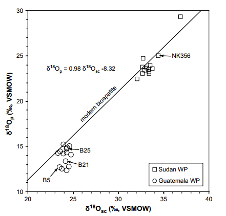 圖3:用弱預(yù)處理(WP)對(duì)危地馬拉和蘇丹骨進(jìn)行了磷酸鹽和結(jié)構(gòu)碳酸鹽(C25法)的氧同位素測(cè)定。還指出了現(xiàn)代生物磷灰石的趨勢(shì)線和方程式(布萊恩特等人,1996;IACUMIN等人,1996)和用于“詳細(xì)研究”的“正?!保?/span>NK356,B5)和“異常”(B21,B25)骨樣本的個(gè)體數(shù)據(jù)點(diǎn)。