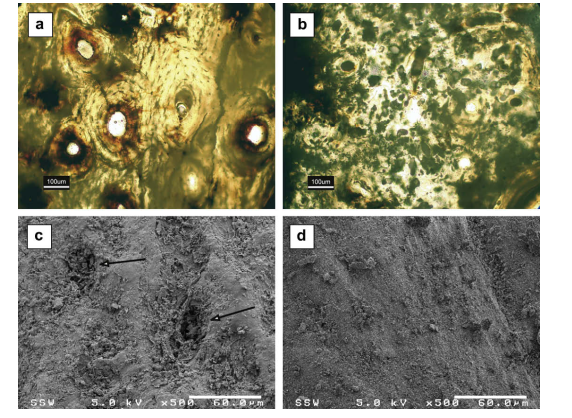 圖4。透射光從骨的橫截面、70~100毫米厚(A、B)和骨表面(C,D)的SEM顯微鏡中獲取的光學(xué)顯微照片。(a)保存完好的骨和完整的骨(“正常”標(biāo)本B5)。一種渾濁的黑色褐色物質(zhì)和鐵染色(紅色)覆蓋樣品的部分。(b)用黑褐色物質(zhì)和顆粒狀材料(“反?!痹嚇?/span>B21)替換原始骨微觀結(jié)構(gòu)。(c)“正?!痹嚇?/span>NK356的骨膜表面,顯示孔/坑(箭頭)。(d)“異?!睒?biāo)本B25的骨膜表面,缺乏凹坑。