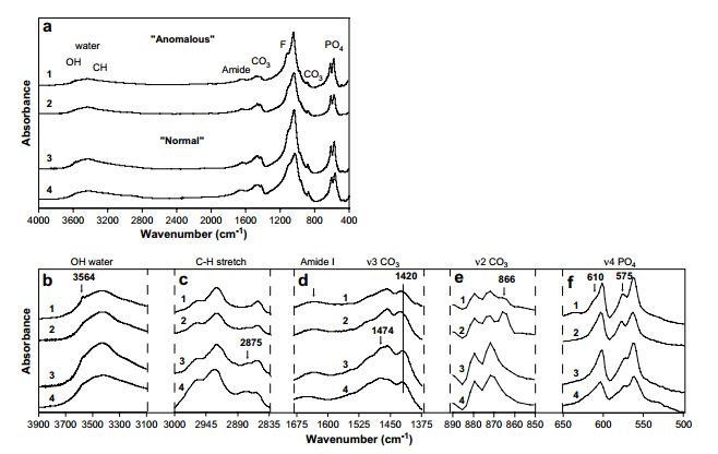 圖5?!爱惓!惫?/span>B25-WP(1)和B21-WP(2)和“正?!惫?/span>B5-WP(3)和NK356- WP(4)的FTIR光譜。(a)整個(gè)光譜,(b)羥基區(qū)域,(c)C-H拉伸區(qū)域,(d)酰胺和N3碳酸鹽區(qū)域,(e)N2碳酸鹽區(qū)域,解卷積,和(f)N4磷酸鹽區(qū)域,解卷積。