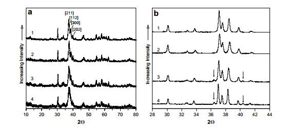 圖6:(a)“異常”骨樣品B25-WP(1)和B21-WP(2)和“正常”骨樣品B5-WP(3)和NK356- WP(4)的XRD圖譜。(b)加熱至950℃后相同骨樣的XRD圖譜。箭頭表示B-TCP峰值。