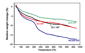 圖7:“異常”(B25-WP,B21-WP)和“正常骨”(B5-WP,NK356- WP)的熱重分析。