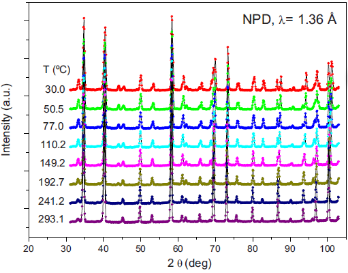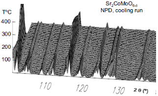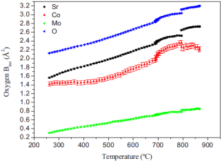 通過原位中子粉末衍射和固態(tài)氧化物燃料電池的陽極在一般工作條件下的膨脹分析,分析了晶體結(jié)構(gòu)的熱演化和Sr2CoMoO6-δ I4/m四方體的熱膨脹。當(dāng)樣品加熱至262 °C以上時化合物會經(jīng)歷從I4/m四方體向Fm-3m立方體的相轉(zhuǎn)變,受到冷卻運(yùn)行期間一些滯后的影響。在高溫立方相中,CoO6和MoO6八面體沒有傾斜,有利于軌道重疊和電子導(dǎo)電性;在這種離子-電子混合導(dǎo)體氧化物中,由于位移因子的增加,氧原子具有很高的遷移率,這就解釋了這種材料作為陽極在單燃料電池中的優(yōu)異性能。膨脹分析顯示了在270 °C有斜率的變化,這可能與四方體向立方體的相變有關(guān)。在立方體中利用膨脹法得到的熱膨脹系數(shù)值與加熱過程中中子衍射數(shù)精化得到的值相當(dāng),并且與固體氧化物燃料電池中常用的電解質(zhì)完全吻合。