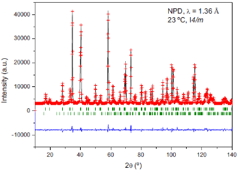 圖2 23 °C 下Sr2CoMoO6-δ在I4/m空間組四方體的觀測(十字架)、計算(實線)和差異性(底部)中子粉末衍射圖,垂直標(biāo)記對應(yīng)于允許的布拉格反射