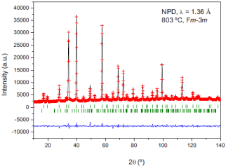 圖5 803 °C下Sr2CoMoO6-δ在Fm-3m空間組立方體的觀測(十字架)、計算(實線)和差異性(底部)中子粉末衍射圖,垂直標(biāo)記對應(yīng)于允許的布拉格反射