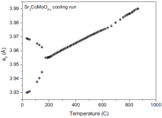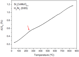 A. Aguadero等人為了模擬固體氧化物燃料電池陽極工作條件下的還原氣氛,Sr2CoMoO6-δ晶體結(jié)構(gòu)的演化一直運(yùn)行在與溫度有關(guān)的中子粉末衍射從23 °C到867 °C的加熱和冷卻循環(huán)的超高真空中。室溫下樣品為I4/m空間組的四方體。當(dāng)這種氧化物加熱至262 °C以上時會經(jīng)歷從I4/m四方體向Fm-3m立方體的相變。在冷卻過程中這種相變發(fā)生在低于先前描述的氧化樣品加熱時相轉(zhuǎn)變溫度25 °C的溫度下,并受到明顯滯后的影響。高溫立方相中CoO6和MoO6八面體沒有傾斜,有利于軌道重疊和電子導(dǎo)電性。氧原子的高遷移率是由位移參數(shù)的升高引起的,例如在867 °C為3.2 ?2。這兩個因素都有利于這種離子-電子混合導(dǎo)體氧化物在單燃料電池中作為陽極的優(yōu)異性能。在5%的H2/N2氣流下,使用Linseis的L75H1000熱膨脹儀進(jìn)行了熱膨脹分析。膨脹分析顯示了在270 °C有斜率的變化,這可能與四方體向立方體的相變有關(guān)。在50 °C到270 °C的溫度范圍內(nèi)四方體的熱膨脹系數(shù)為14.5×10?6 K?1,在270 °C到50 °C的溫度范圍內(nèi)立方體的熱膨脹系數(shù)為11.2×10?6 K?1。