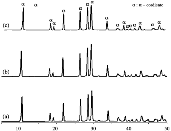 圖2 在(a)在1350 °C燒結(jié)3 h、(b)在1350 °C燒結(jié)3 h和(c)在1400 °C燒結(jié)1 h的堇青石X射線衍射圖譜