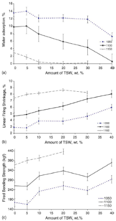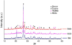 針對工業(yè)化前的研究結(jié)果,報道了脫水篩渣作為衛(wèi)生潔具廢渣的替代物后對幾種不同峰值溫度燒制的實(shí)驗(yàn)赤陶地磚配方的物理力學(xué)性能和微觀結(jié)構(gòu)的影響。結(jié)果表明,在不同的燒成溫度下,脫水篩渣的加入均能改善玻璃化過程。雖然B20配方在1150 °C下燒制具有最高的彎曲強(qiáng)度和最低的水吸附(分別為436 kgf和0.1%),但是對同一個配方來說在1100 °C下燒制的彎曲強(qiáng)度值380 kgf和水吸附值0.6%也可以被視為可接受的值。脫水篩渣中硼和高堿土氧化物的存在改善了其物理力學(xué)性能。這些氧化物在燒制溫度達(dá)到峰值時變?yōu)檎承暂^小的液相,促進(jìn)了玻璃化。根據(jù)XRD數(shù)據(jù),發(fā)現(xiàn)莫來石是燒結(jié)過程中形成的主要晶相。雖然在脫水篩渣配方的結(jié)晶相含量之間沒有發(fā)現(xiàn)任何相當(dāng)大的差異,但是非晶態(tài)相的量隨著脫水篩渣摻入量的增加和燒成溫度的升高逐漸增加。
