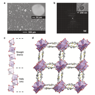 圖1:CAU-23晶體結(jié)構(gòu)的測(cè)定及其細(xì)節(jié)。a. CAU-23的SEM圖像。b. 利用CAU-23納米單晶cRED數(shù)據(jù)重建的3D倒易晶格。c. 正、反共角AlO6多面體的重復(fù),形成了CAU-23的無(wú)機(jī)結(jié)構(gòu)單元。d. 沿著[010]投影的CAU-23的完整結(jié)構(gòu);為了清楚起見(jiàn),省略水分子。