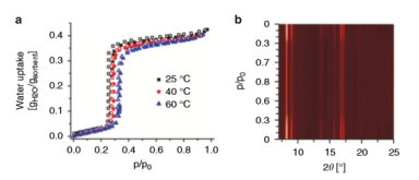 圖2:CAU-23的吸水性能。a. 在三種不同溫度下記錄的吸水等溫線(填充符號(hào)=吸附;空心符號(hào)=解吸)。b. 不同相對(duì)水壓下CAU-23的PXRD圖譜。